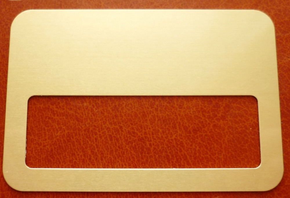 Заготовка для бейджа 76*51 мм, окно 64*20 мм, цвет золото, изготовлена из сублимационного алюминия толщиной 0,5 мм и предназначена для нанесения сублимационной печати.